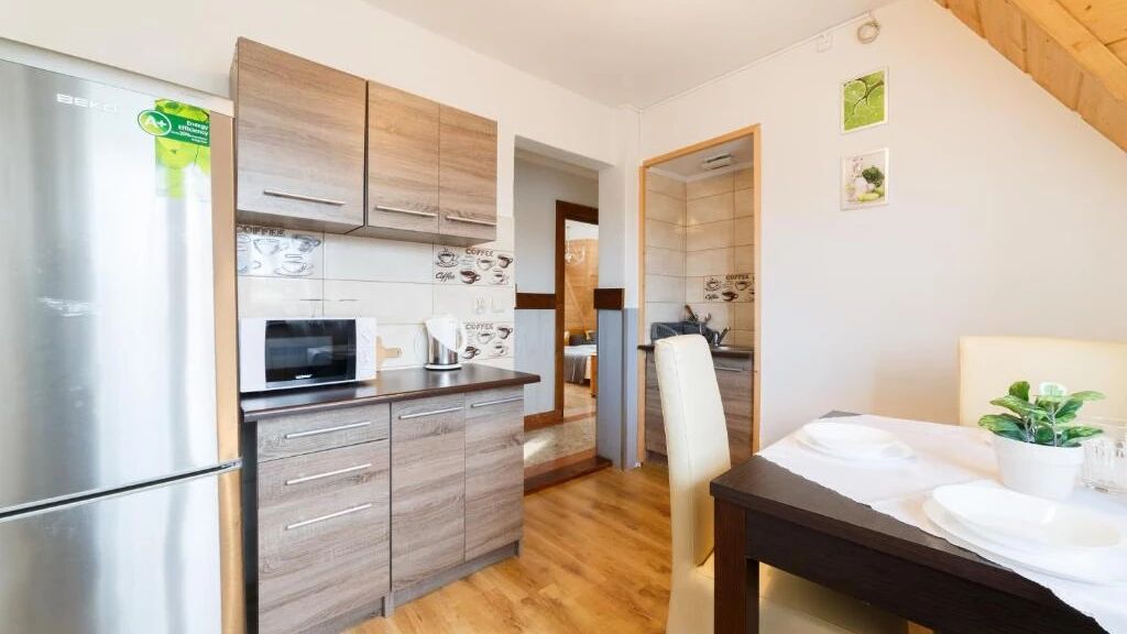- w budynku, w którym mieszkamy: w pełni wyposażony, ogólnodostępny aneks kuchenny (czajnik elektryczny, kuchenka mikrofalowa, lodówka, oraz zastawa stołowa i sztućce), narciarnia z suszarnią, siłownia wyposażona m.in. w atlas i rower magnetyczny firmy kettler, orbitrek,